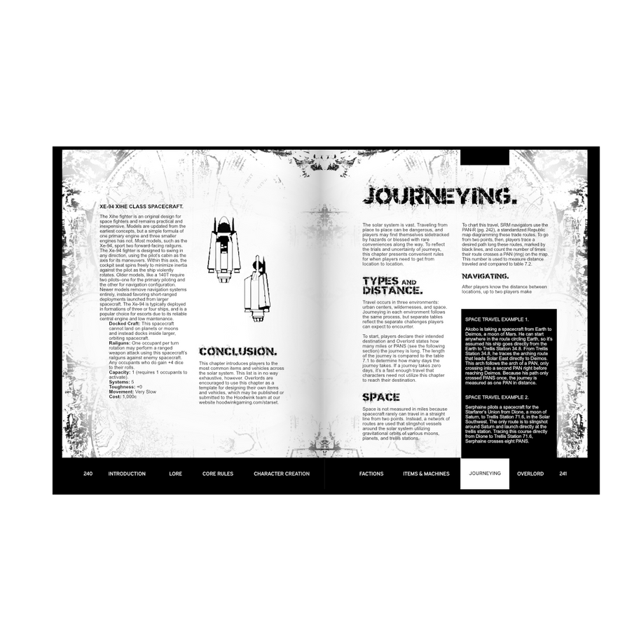 Starset is driven by a unique dice pool system where players’ dice pools double as their health. Dice are spent for actions, but players receive fewer and fewer dice as fatigue and injuries build up. Actions targeting other players or NPCs resolve after the targets’ turn, allowing strategic interactions and active assistance or inhibition. Rules for exploring and space travel keep characters evolving during long treks across the solar system, and a lists of pre-written actions keep gameplay smooth for even the newest players.